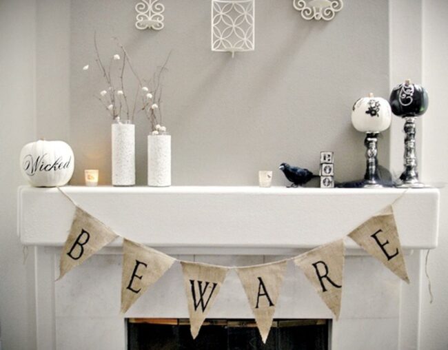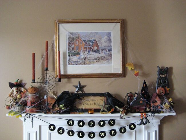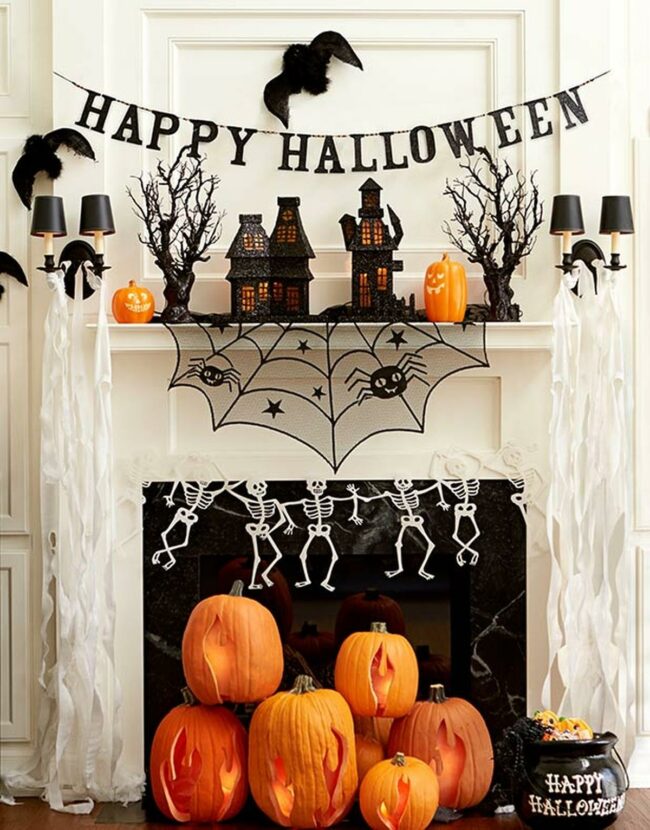 Halloween charm takes center stage on this fireplace with a festive banner draped across its top and spooky cobwebs stretching along the mantel.