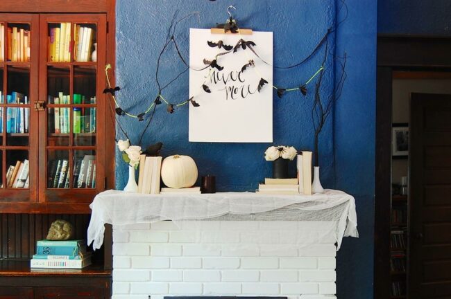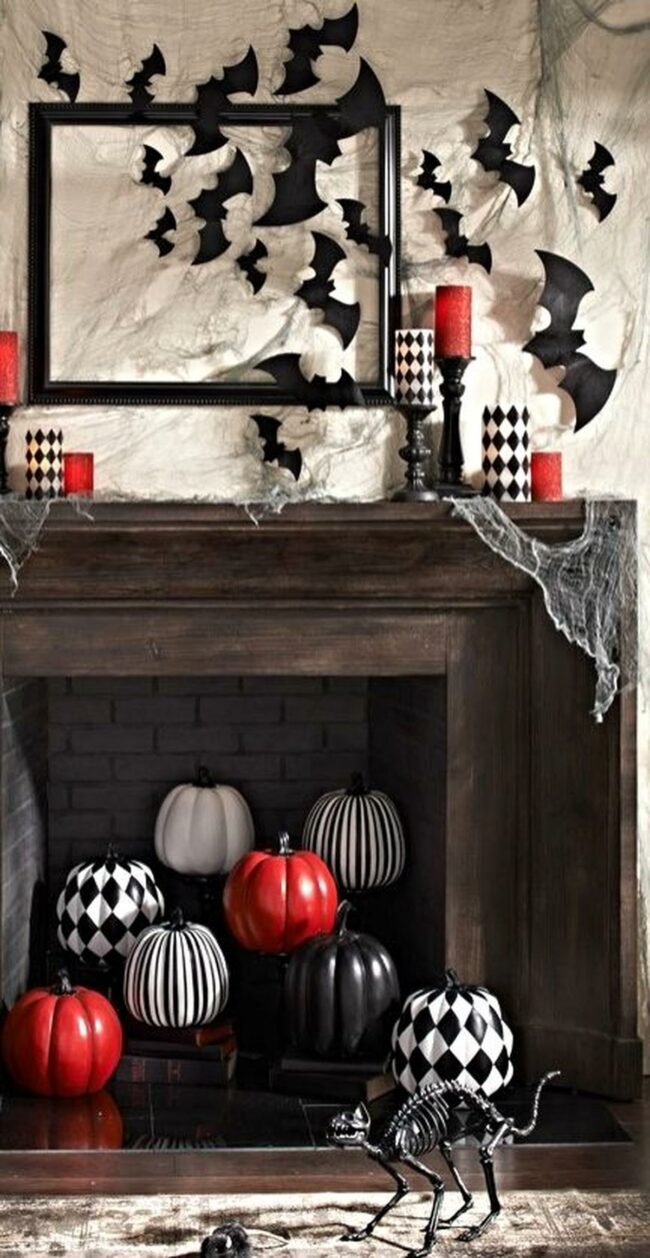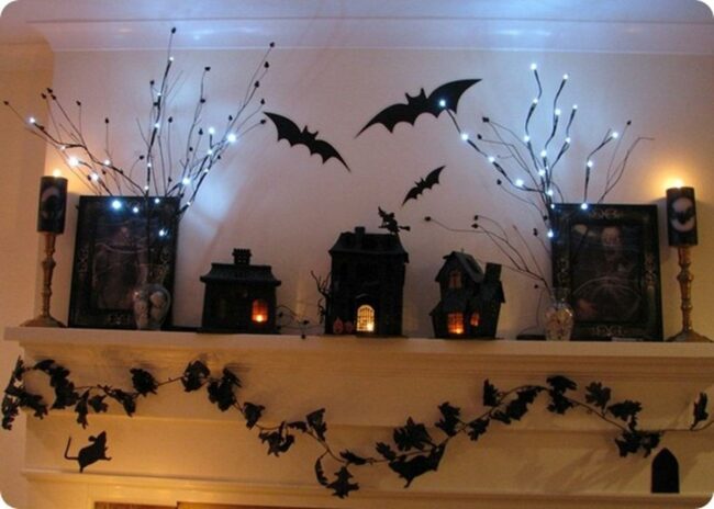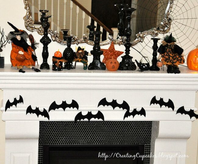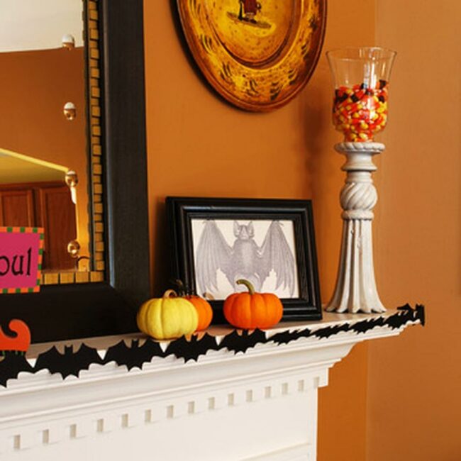 Paper bats in black dance along the mantel edge, creating a playful spooky mood without being scary.