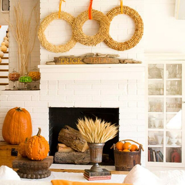 Three round straw wreaths hang elegantly above the mantel, complementing the rustic wooden "Trick or Treat" sign that sits below them.