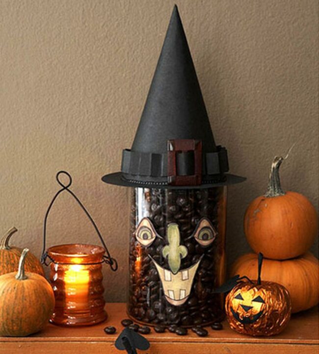 The tall candle holder with its glass jar of colorful candy brings a sweet element to the Halloween display.