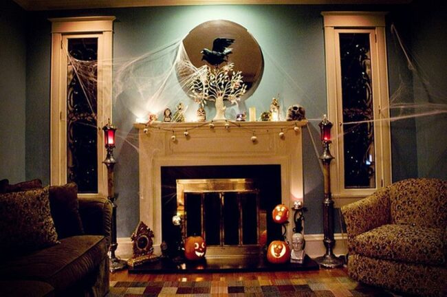 Halloween magic comes alive in this room where spooky decorations adorn the fireplace with haunting elegance.