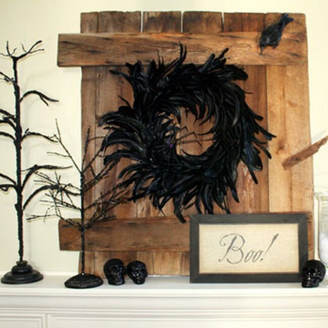 Halloween magic comes alive in this room where a striking black feather wreath dominates the wooden backdrop as its dark, rustic charm sets the mood.