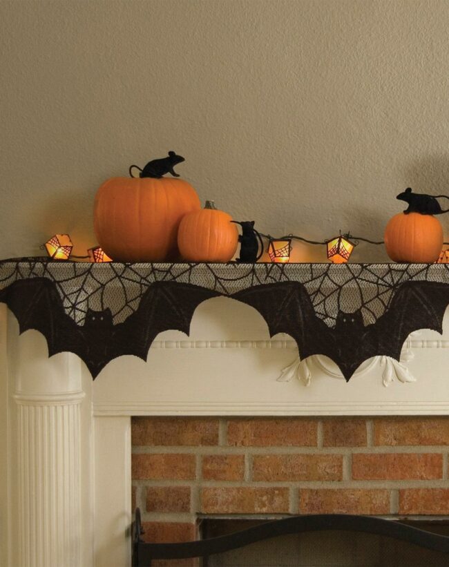 Halloween magic comes alive on this white fireplace adorned with spooky black lace featuring intricate spider and bat patterns.