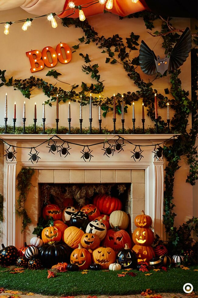 Tall black and white striped candles create perfect balance while carved pumpkins with playful faces fill the hearth below, cleverly stacked for maximum visual impact.