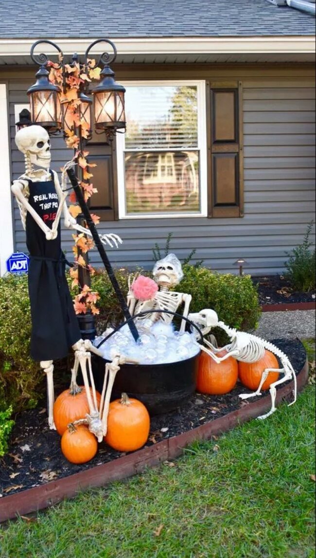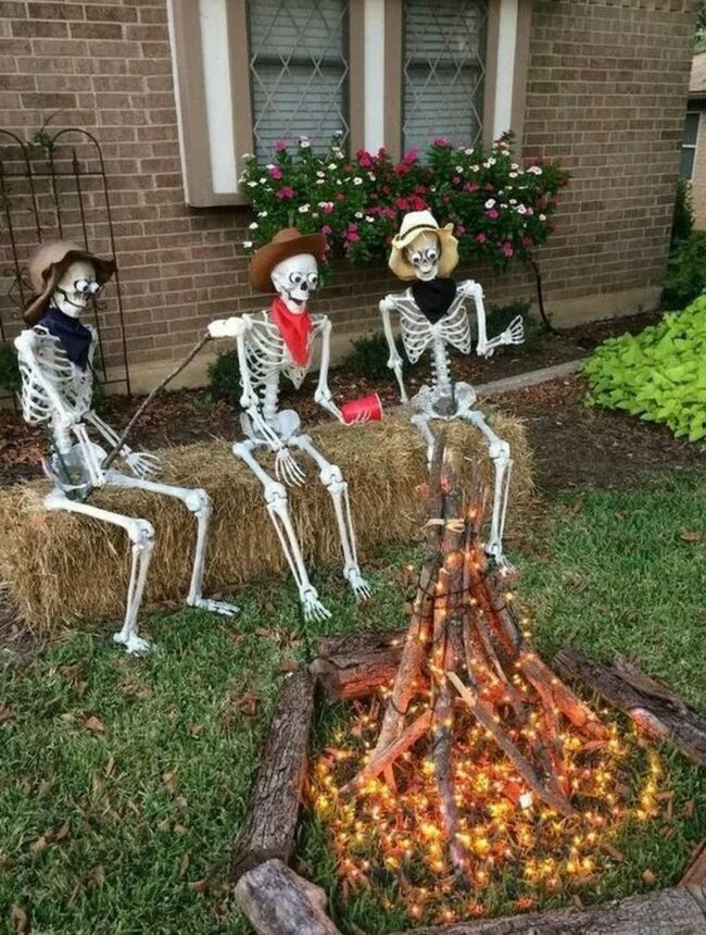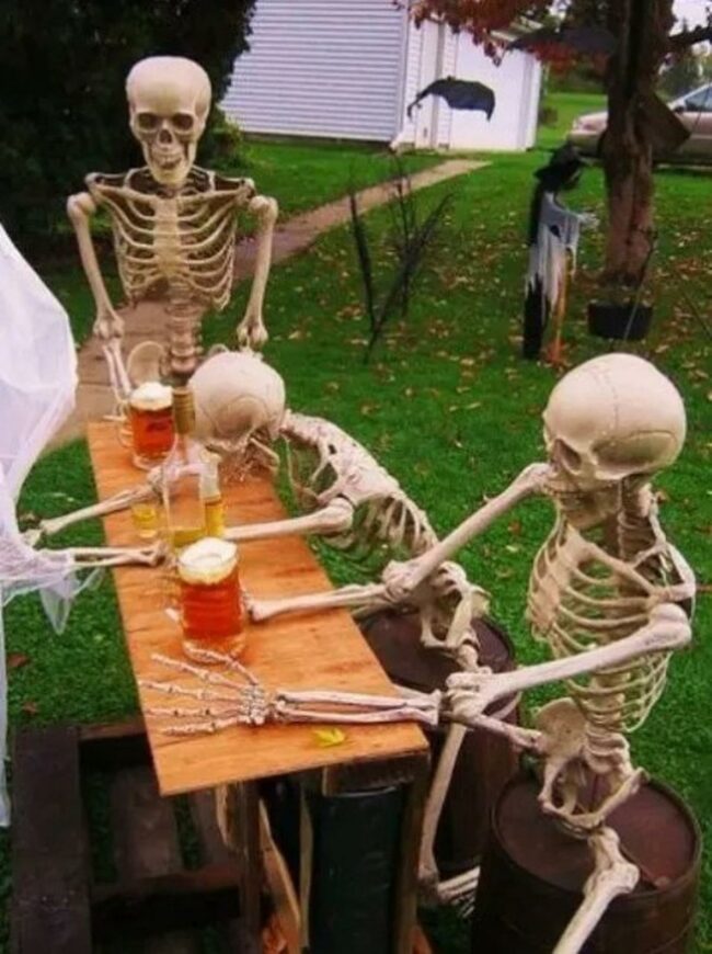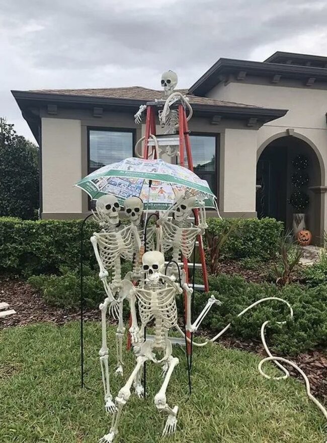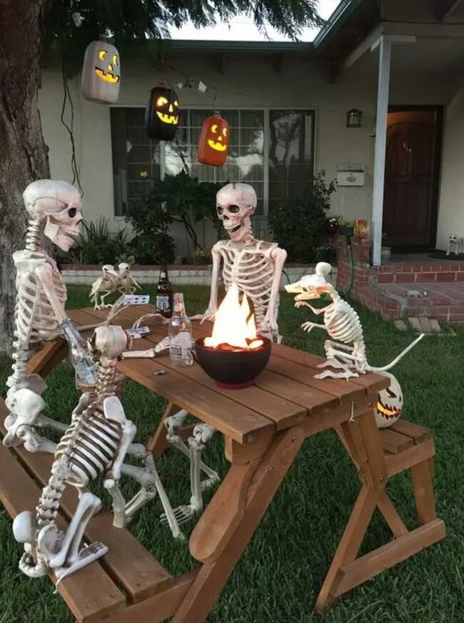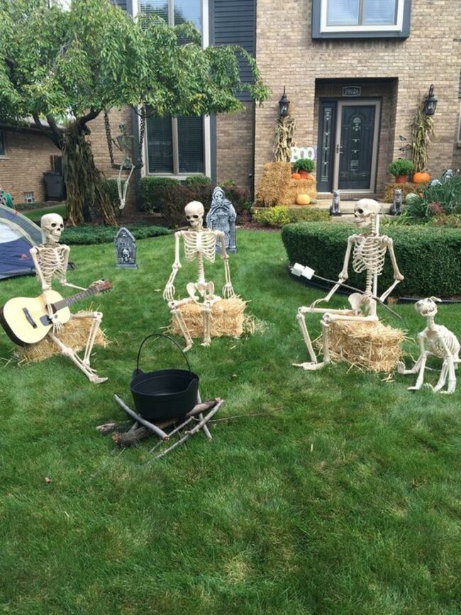 Halloween skeletons are a hilarious outdoor display that transforms an ordinary yard into a comedy scene.