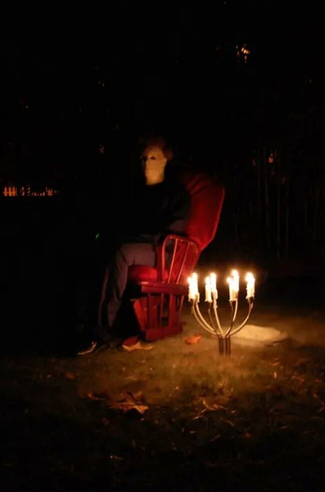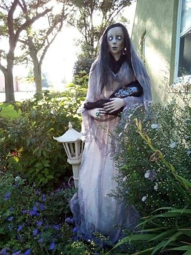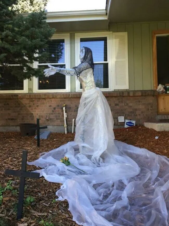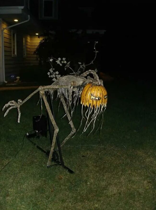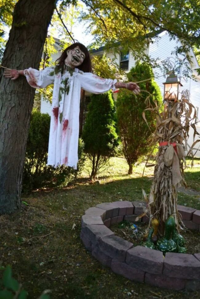 Halloween decorations showcase spine-chilling creativity in this eerie outdoor scene.