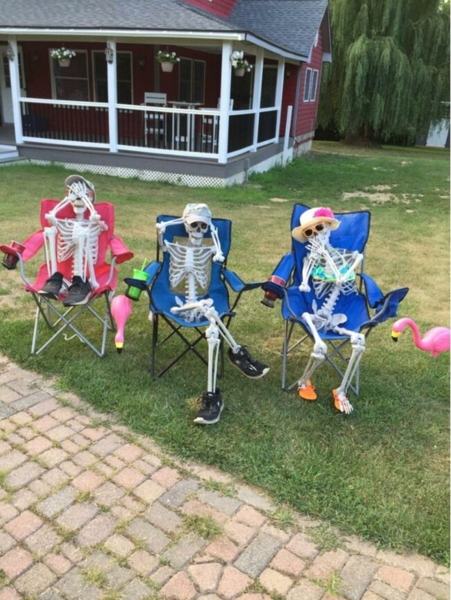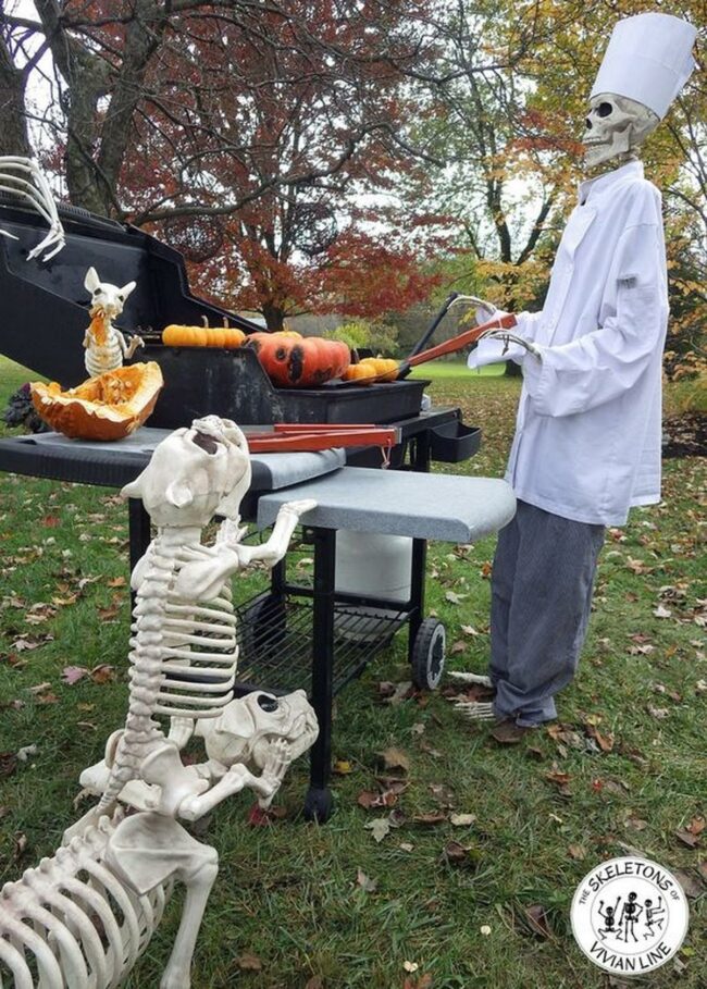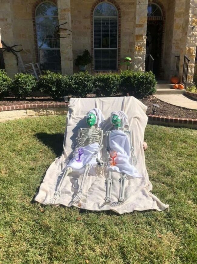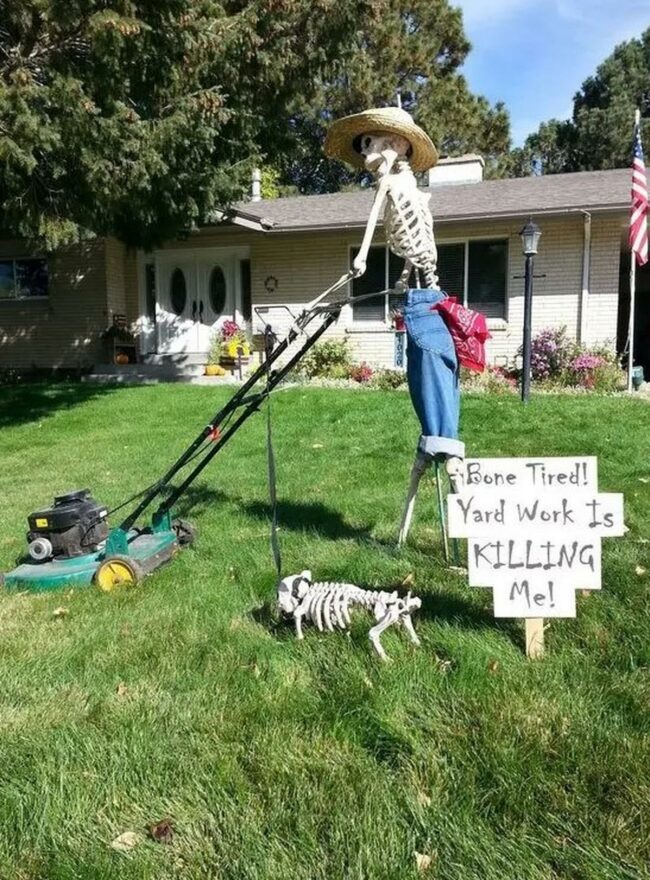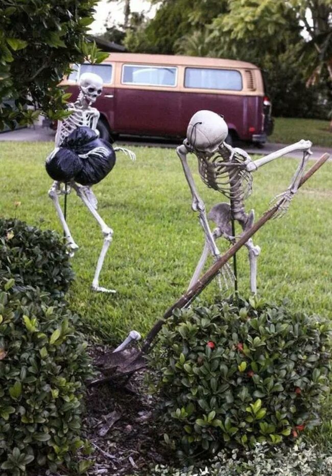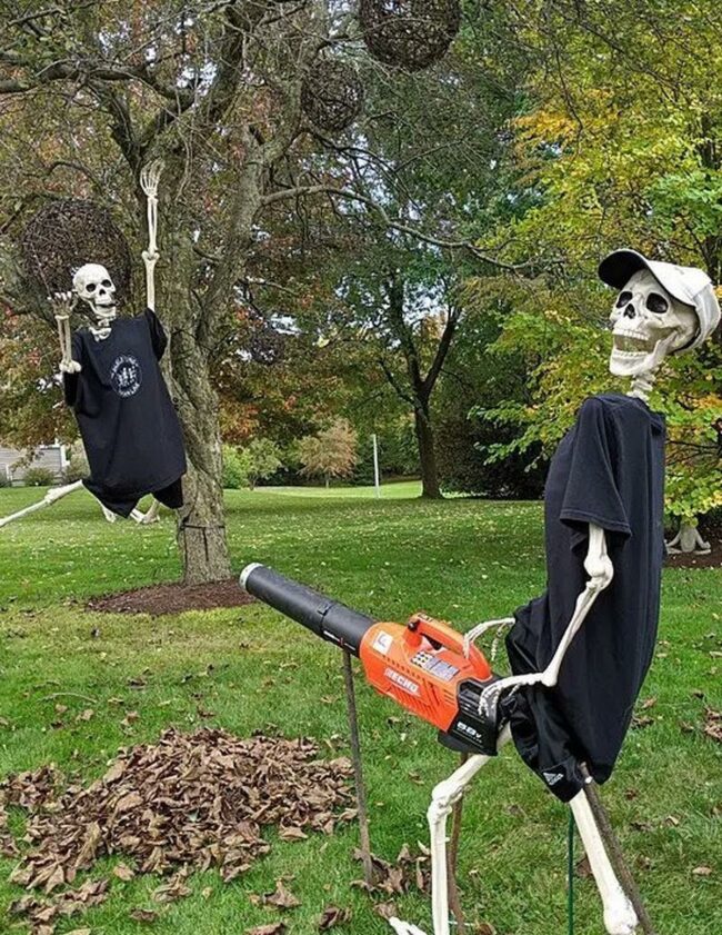 Halloween skeletons are a hilarious backyard spectacle that brings dark humor to lawn decorations.