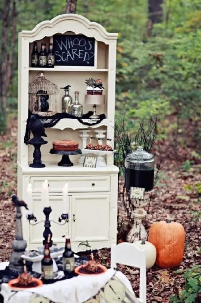 Scattered leaves carpet the ground, creating a natural backdrop for this spooky culinary tableau.