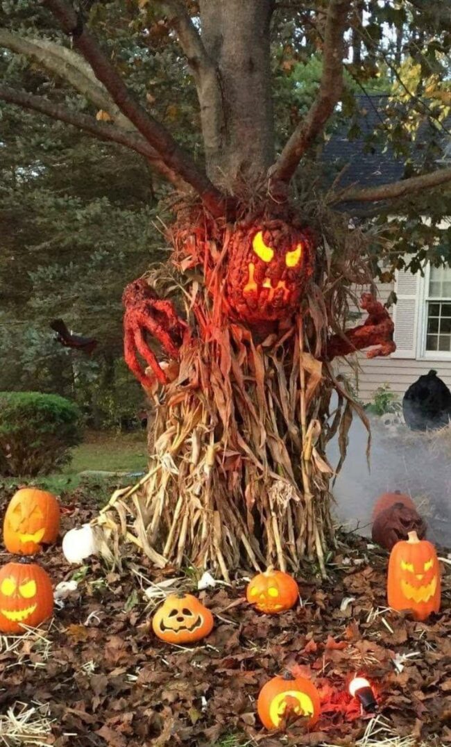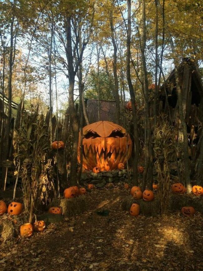 Trees frame the scene with seasonal colors, lending depth and texture to the Halloween-themed display.