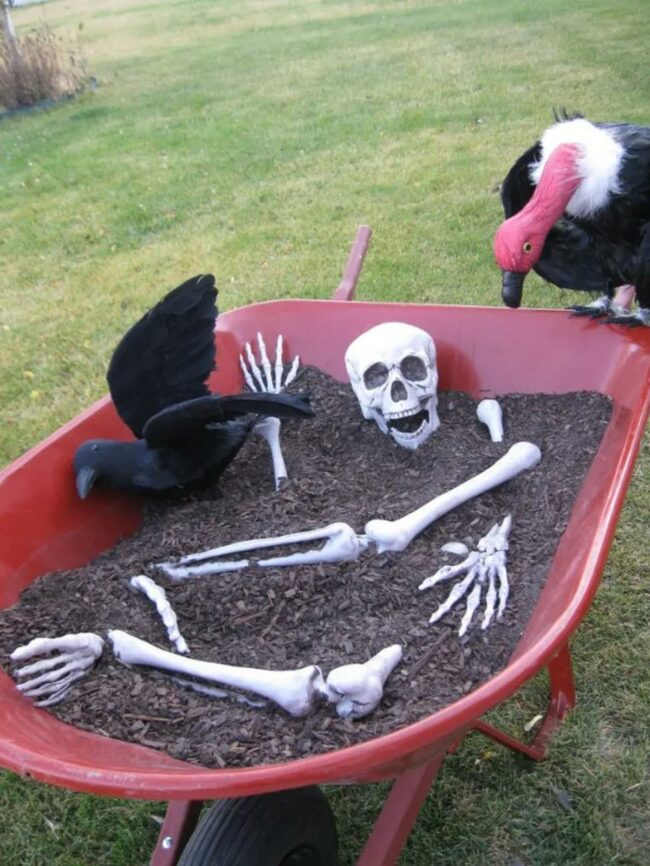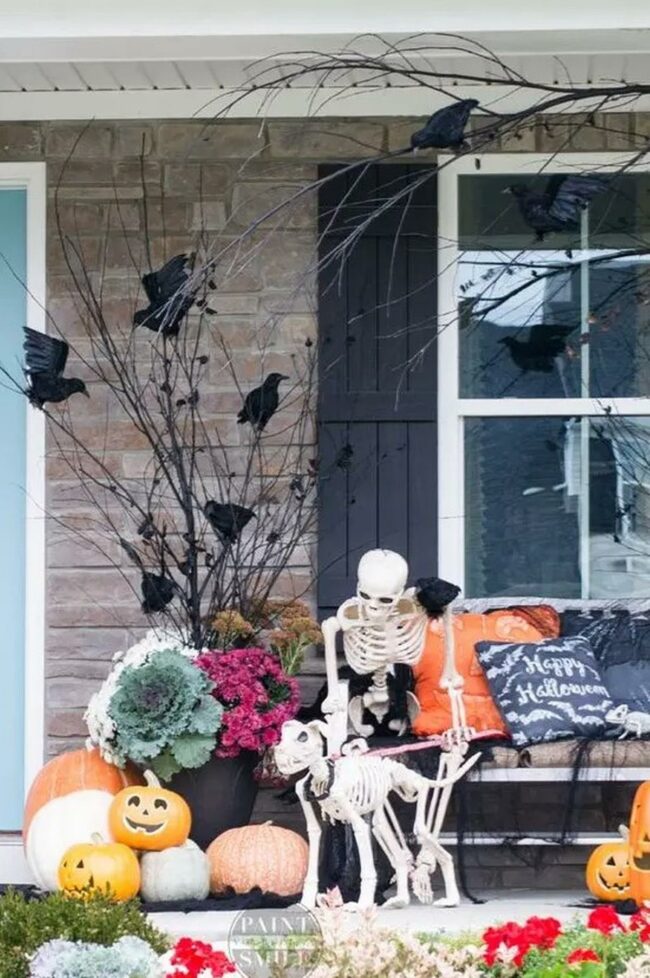 Decorative skeletons bring humor and unexpected delight to this creative outdoor arrangement.