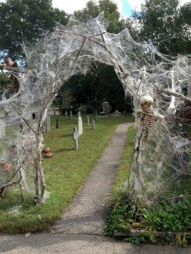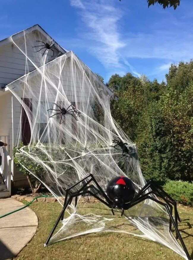 Surrounding bushes and lawn areas become entangled in ghostly white webbing, extending the haunting scene.