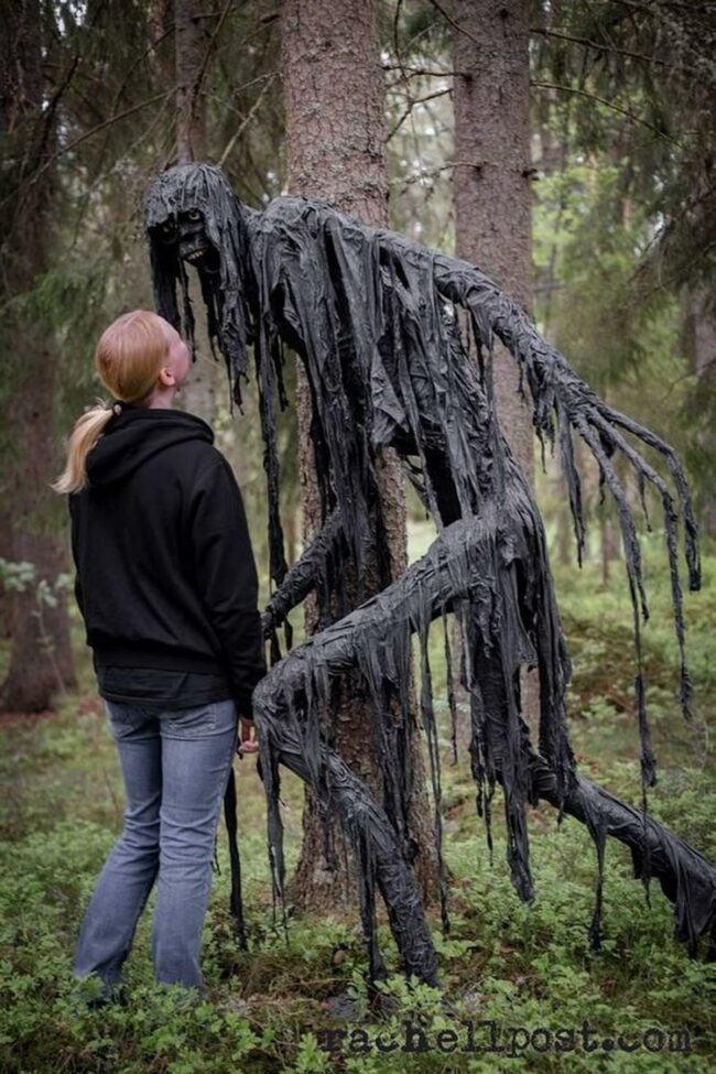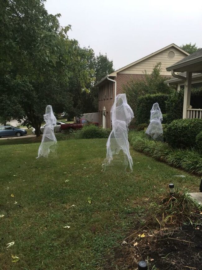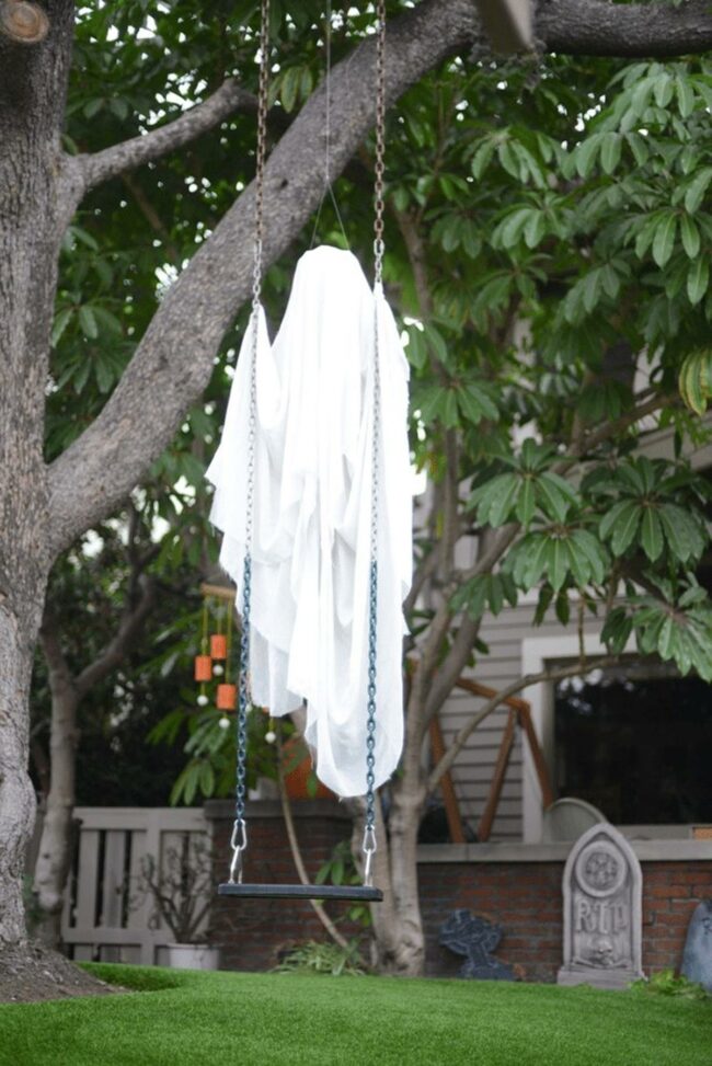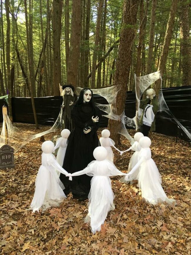 Ghostly white figures hanging from tree branches instantly grab attention with their eerie presence.