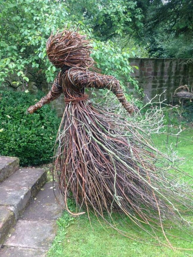Long, thin sticks form a sweeping skirt that adds dynamic motion to the sculpture's shape.