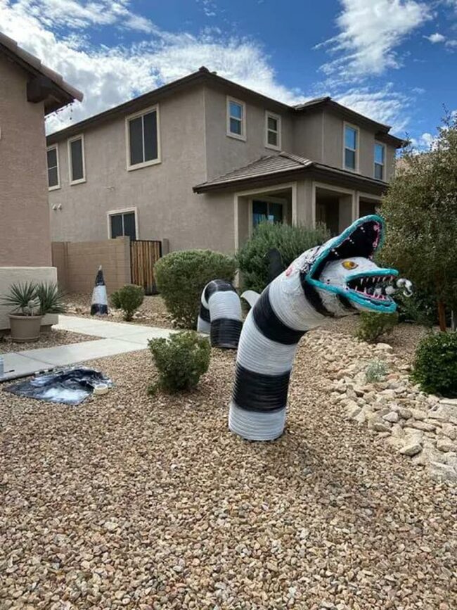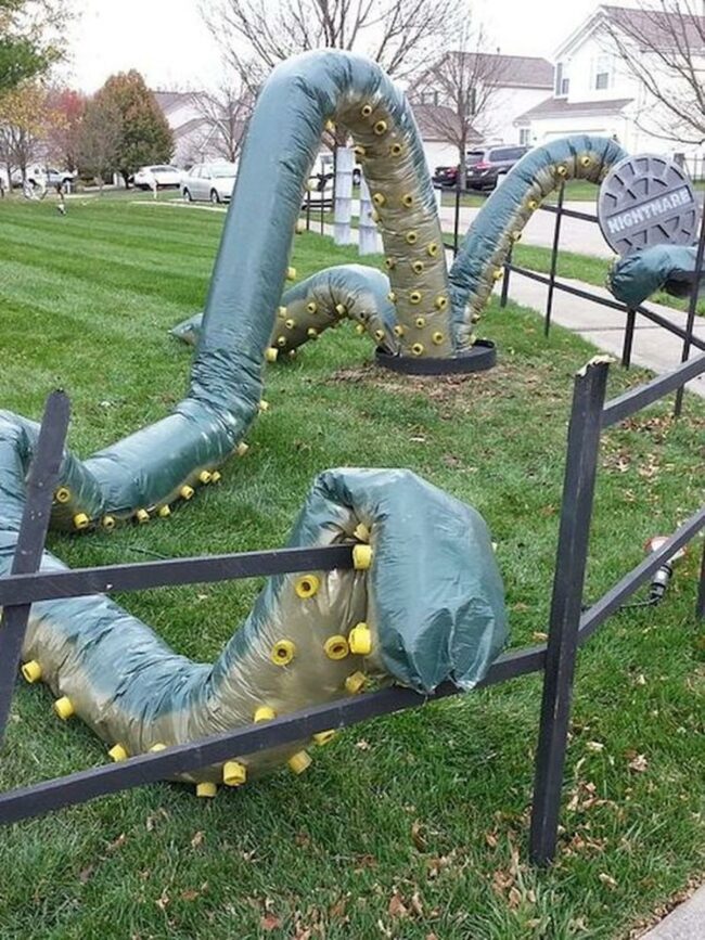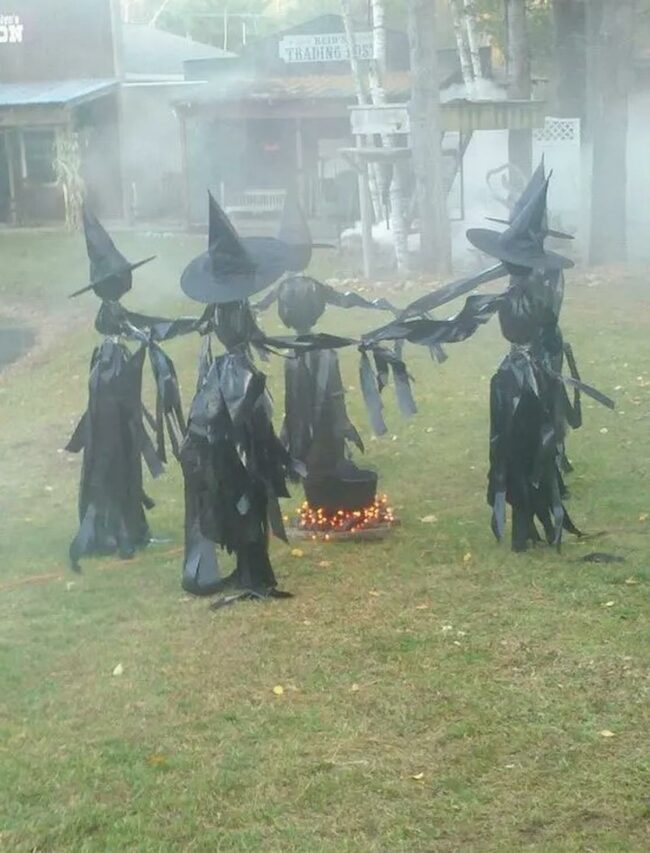 Their unexpected arrangement transforms a simple yard into a whimsical Halloween display.
