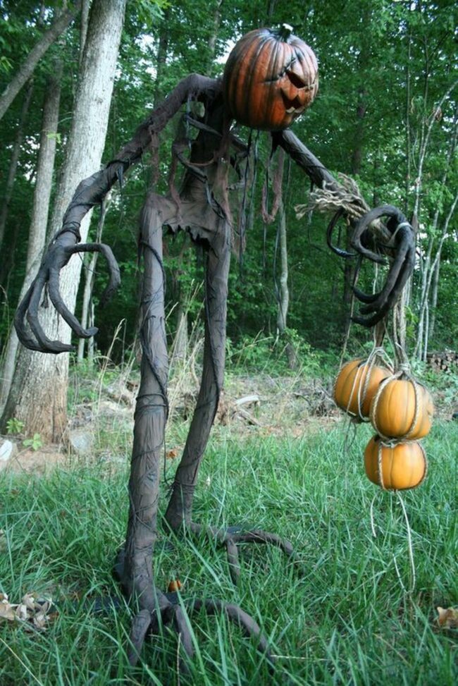 Some pumpkins sit low while others balance on sticks or branches, providing interesting visual heights.