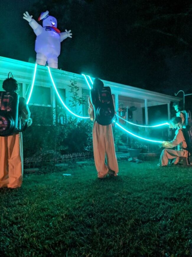 Stone walls and peach siding of the house provide a warm backdrop to these ghostly characters.