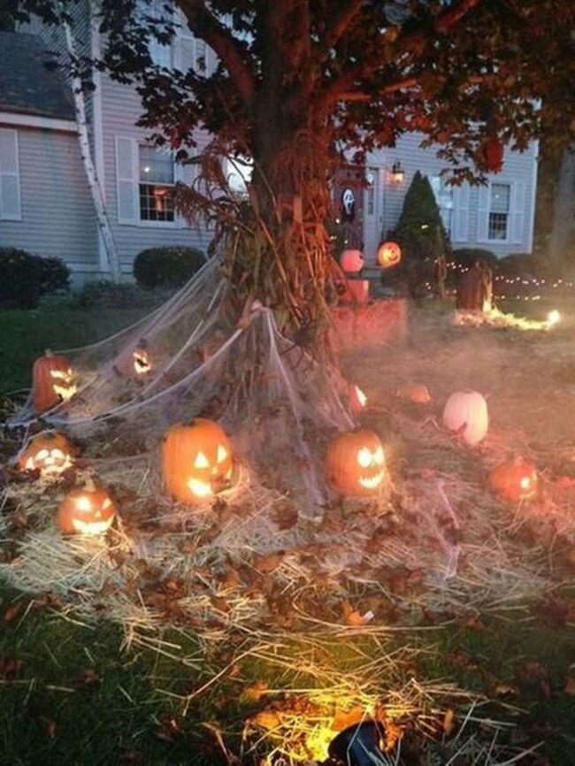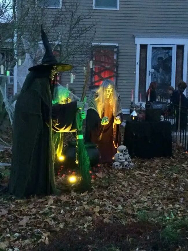 Soft lighting and strategic positioning make this outdoor display a memorable Halloween experience.