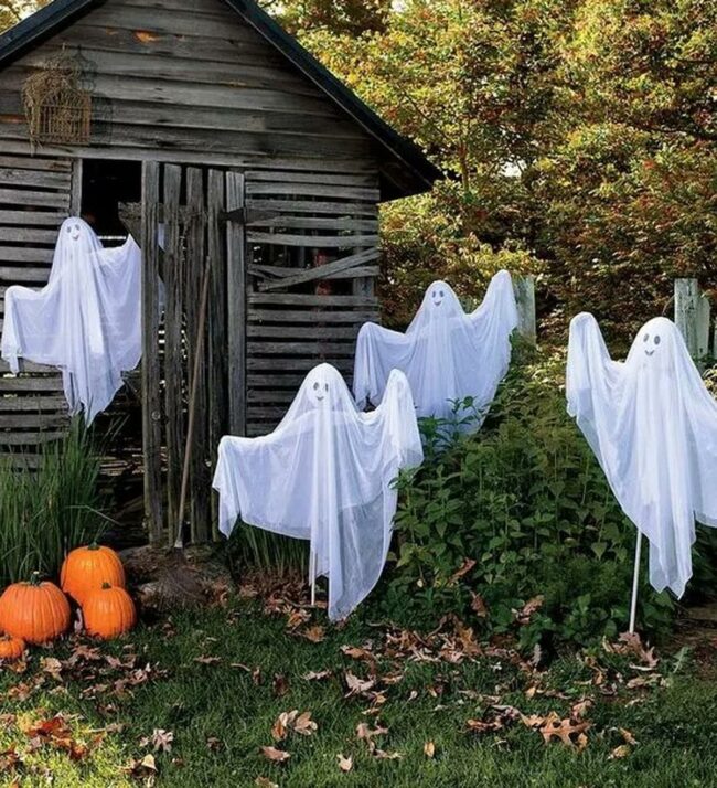 Soft white ghosts made from cloth float above the grass, smiling with cheerful faces that invite playful spirits.