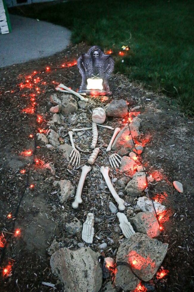 Red twinkling lights outline bone structures, creating an eerie glow that catches every passerby's attention.