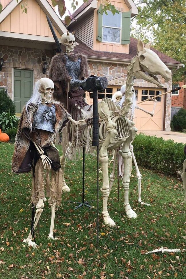 Three playful skeletons steal the show with their creative positioning around the lawn.