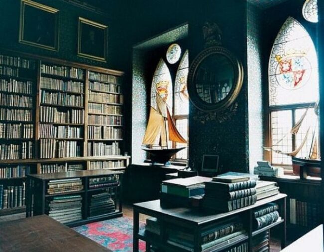 Dark green walls create a calming backdrop for the impressive floor-to-ceiling shelves packed with timeless literary treasures.