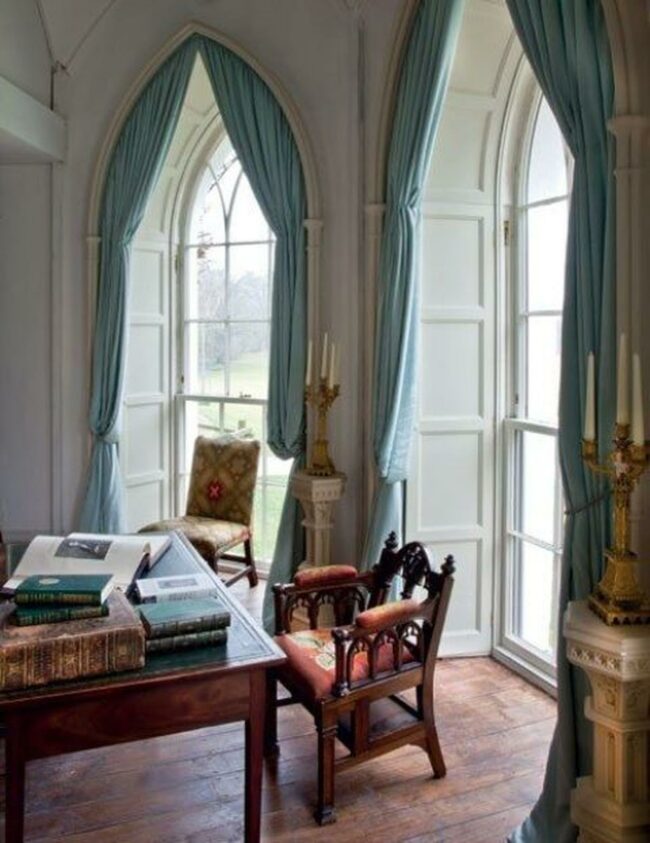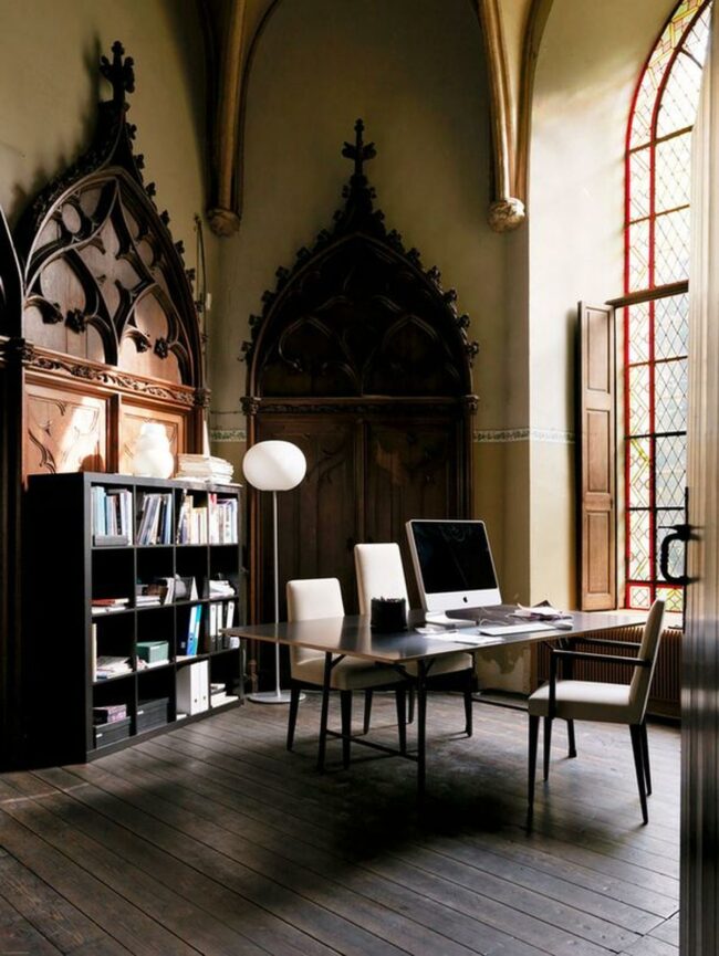 Tall, pointed wooden arches blend old-world charm with the modern desk setup, creating a perfect balance between past and present.