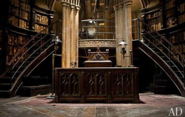 An ornately designed wooden desk commands attention at the front, offering the perfect spot for deep concentration and research.