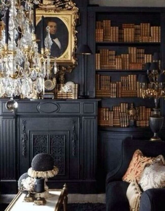 Moody lighting from wrought iron fixtures casts intriguing shadows across shelves filled with leather-bound books.
