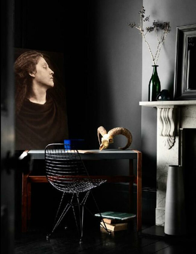 Dark walls create a striking backdrop for artwork in this modern home office that feels both warm and inviting.