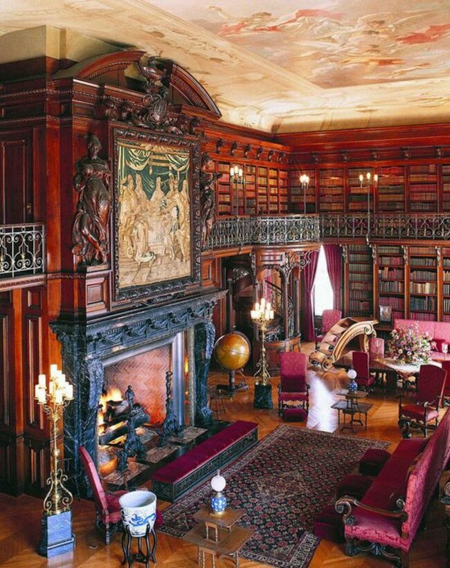 Grand wooden shelves stretching to the ceiling house countless aged books in this magnificent library space.