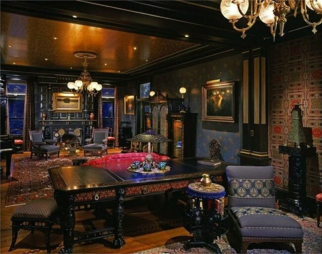 Gothic home office and library decor combines dramatic aesthetics with functional design elements for a truly captivating workspace.