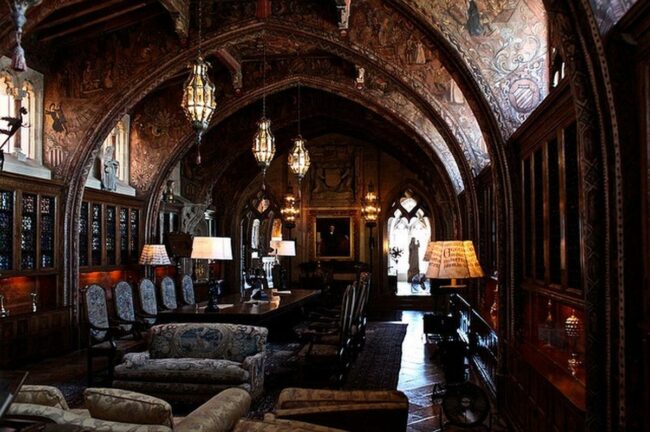 Rich color palettes featuring deep burgundies, forest greens, and midnight blues complement the characteristic pointed arches and intricate carvings found throughout such spaces.
