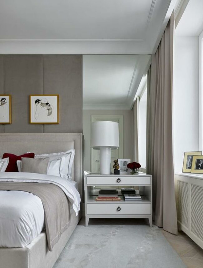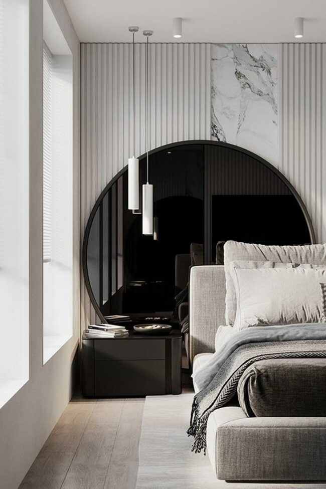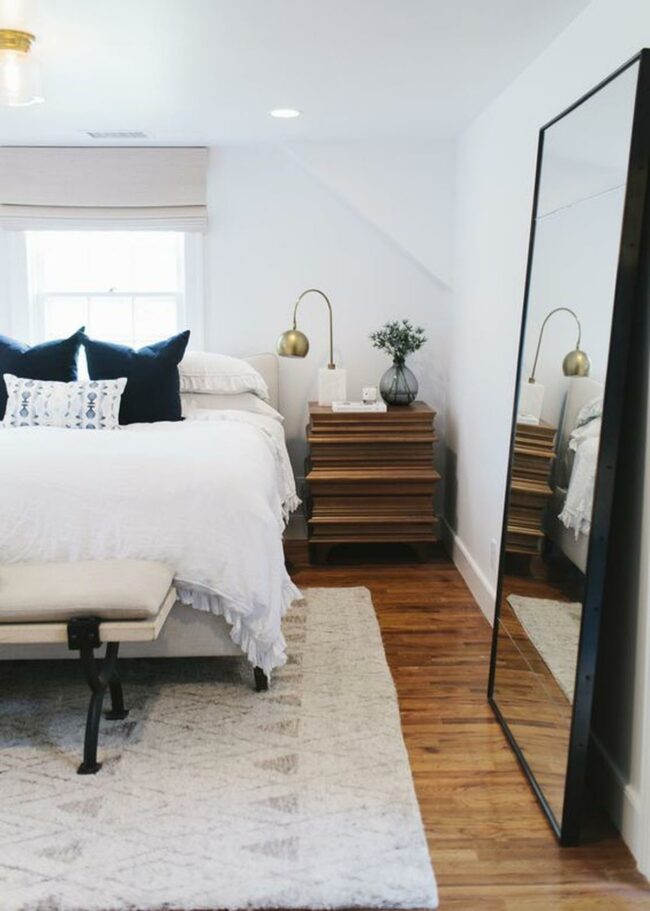 Two tall mirrors behind the bed expand the visual space and reflect light beautifully.