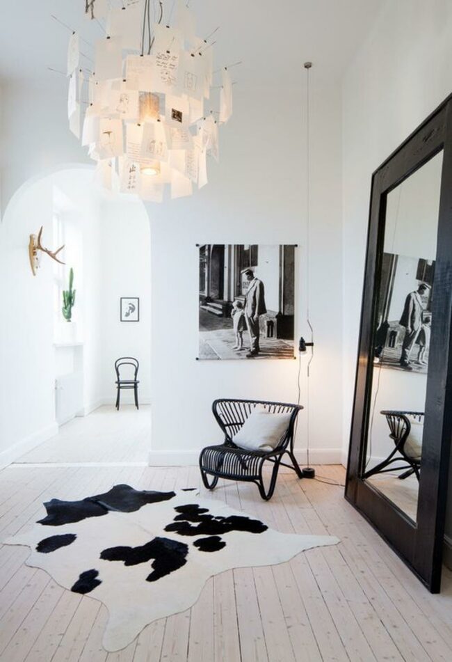 Black-framed accents like the large mirror strategically add depth and visual interest to the room.
