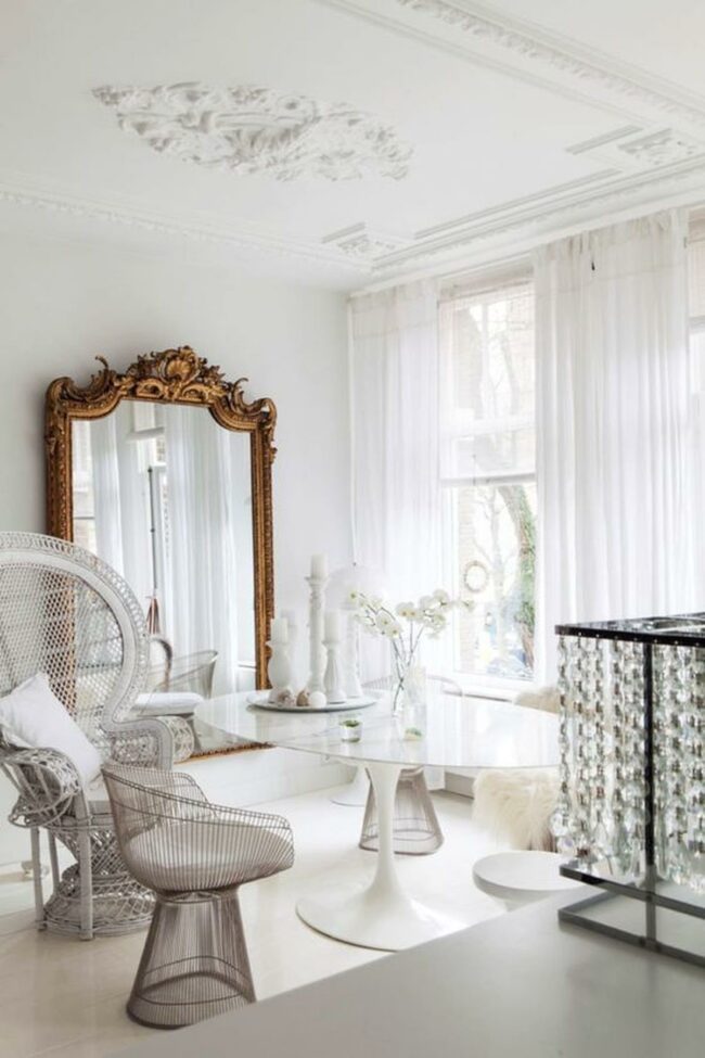 Classic white walls and intricate molding define this sophisticated room's elegant aesthetic.