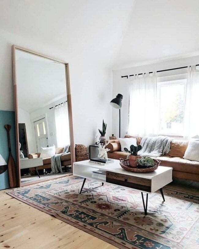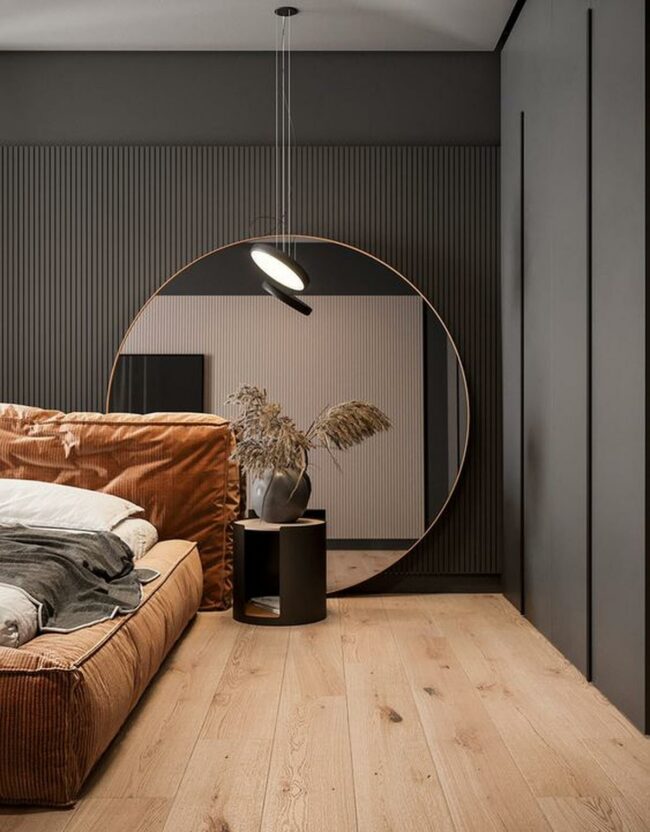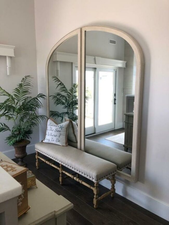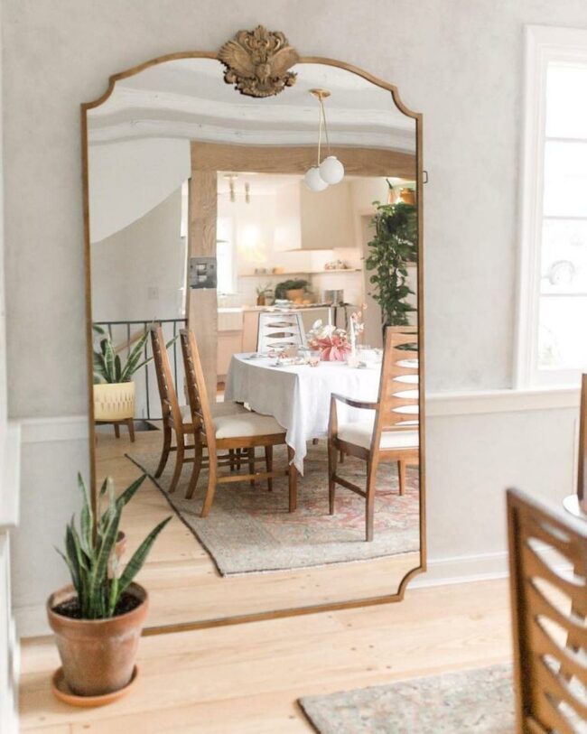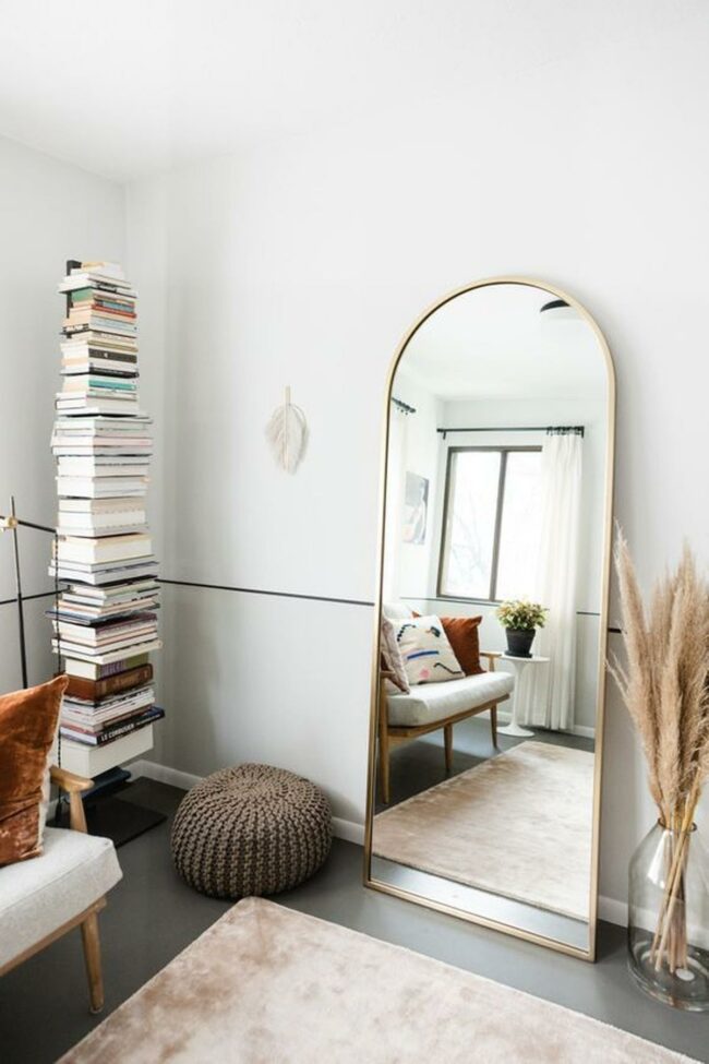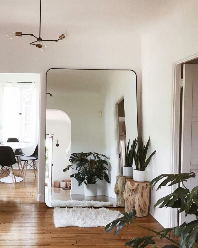 A big, tall mirror with rounded edges leans against the wall, instantly expanding the space's visual depth.