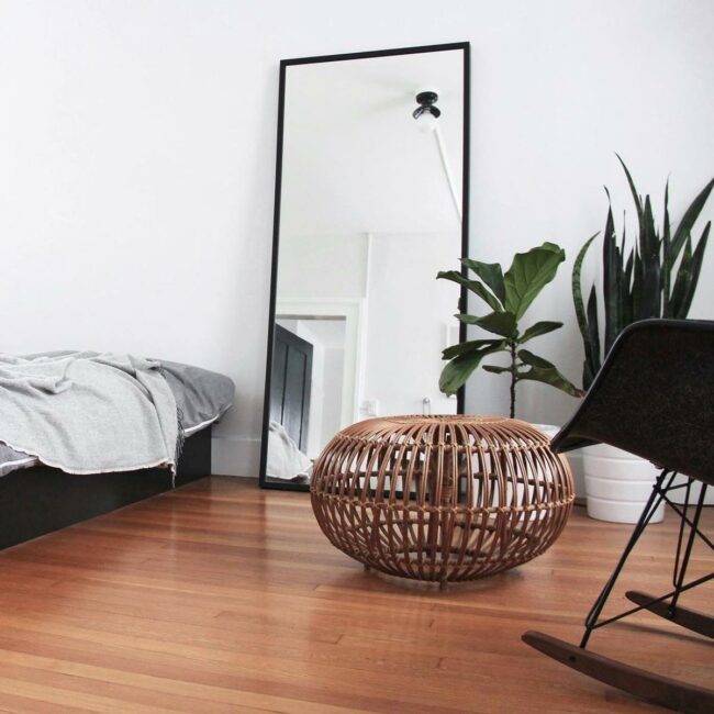 Minimalist design is the star of this serene space, where natural wood floors and a large wooden-framed mirror create an effortlessly cool atmosphere.