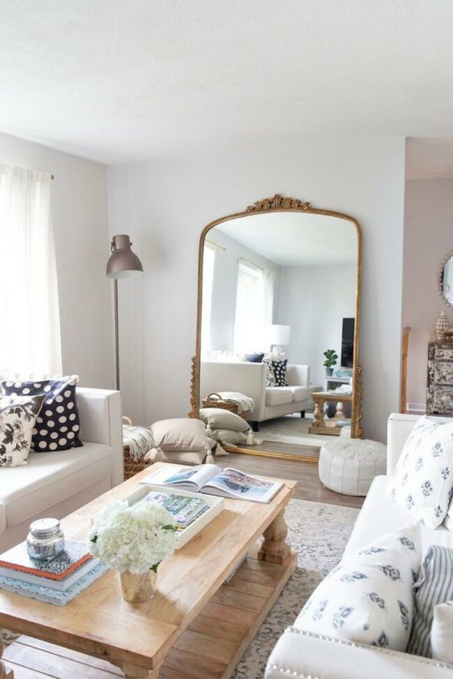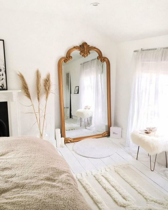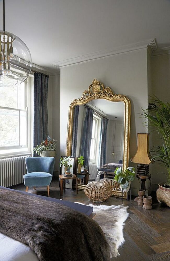 A tall, gold-framed mirror reflects a cozy atmosphere, leaning elegantly against one wall.