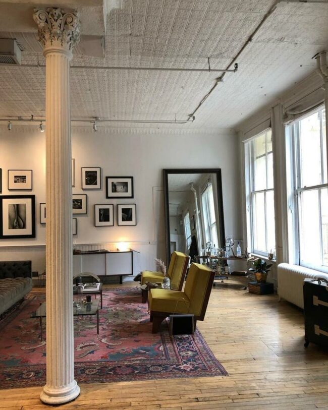 Gold-framed mirrors lean casually against walls, reflecting light and expanding visual dimensions.