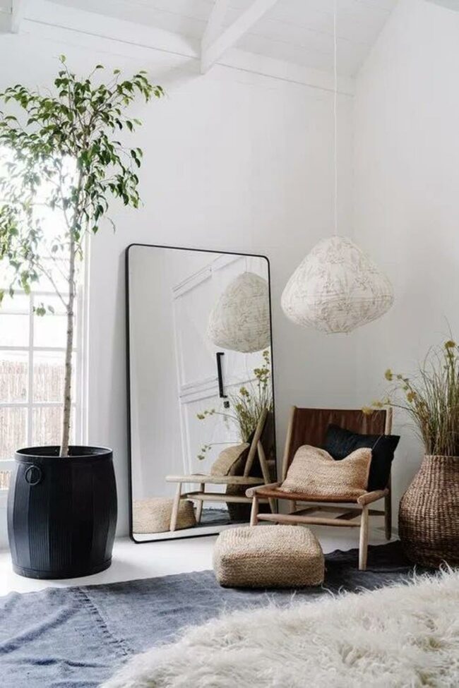 A large mirror strategically leans against the wall, expanding the room's visual depth and reflecting soft illumination.