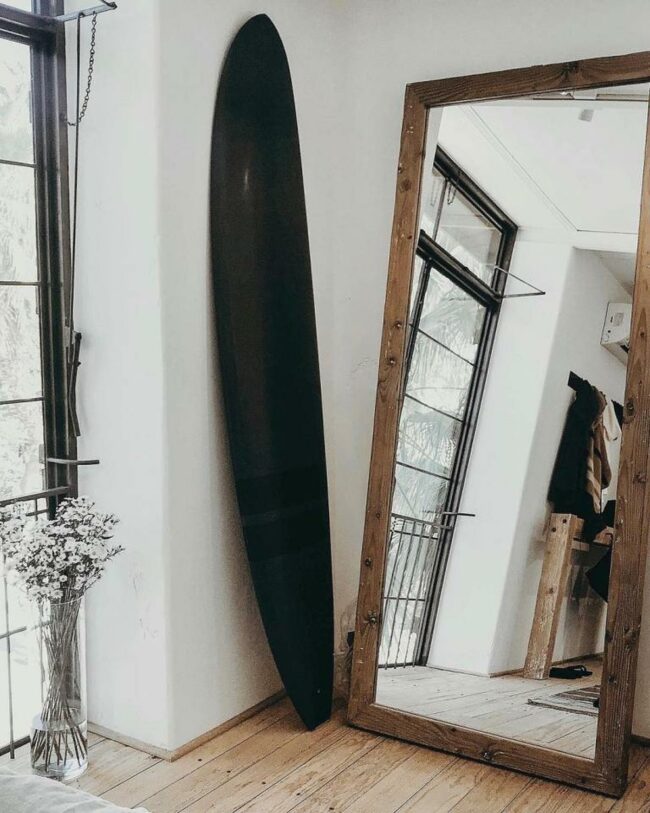 Strategically placed elements like a tall black surfboard add an unexpected, laid-back edge to the scene.