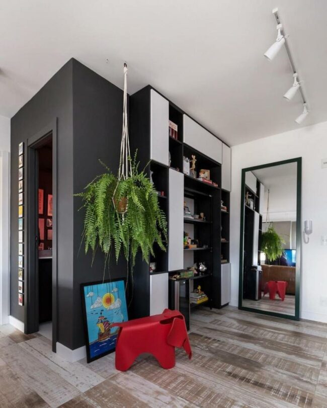 Green plants strategically placed near mirrors and walls add organic life to the space.