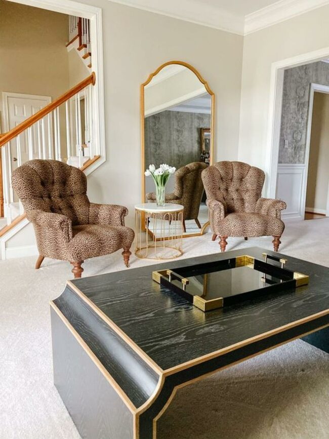 Gold mirrors lean dramatically against walls, instantly adding luxurious glamour to the space.