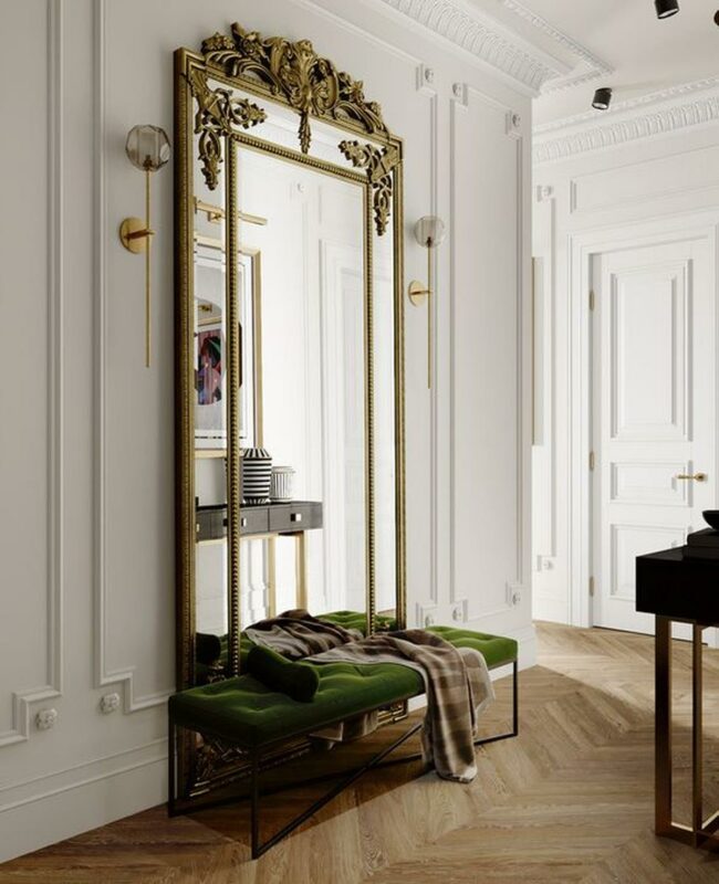 An ornate gold-framed mirror expands the visual depth and reflects light beautifully.