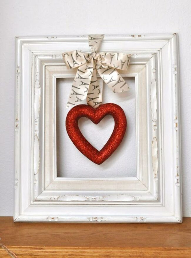 Black-lettered cream ribbons elegantly connect the heart to the frame's top, creating a charming accent.