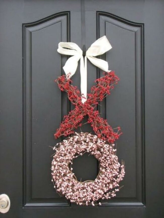 Wide white ribbons connect both wreaths to a dark door, forming an elegant bow at the top.