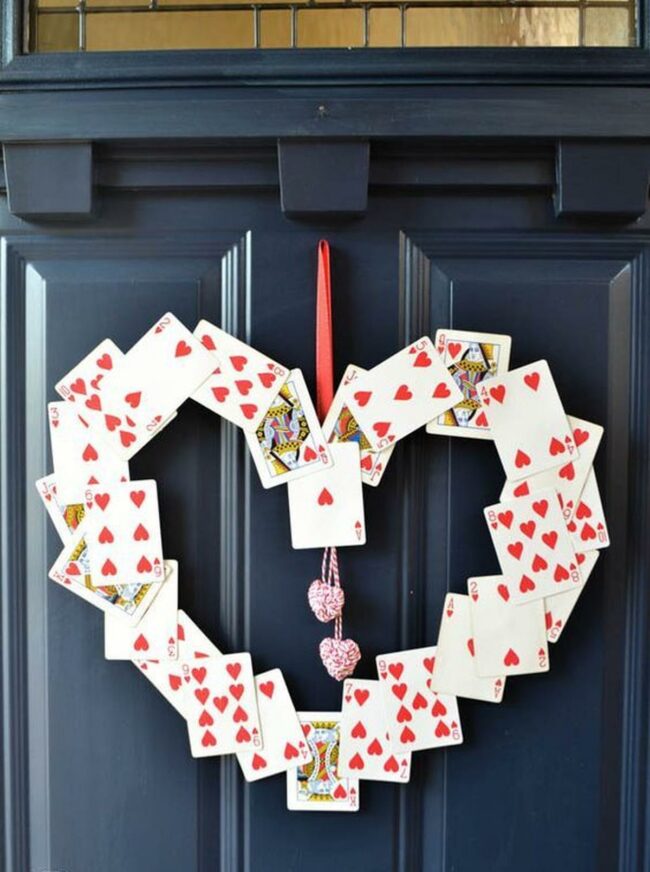 Navy blue door adorns a playful heart-shaped wreath made entirely from playing cards, mostly hearts, creating a whimsical focal point.