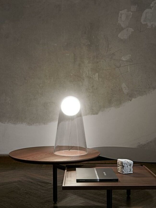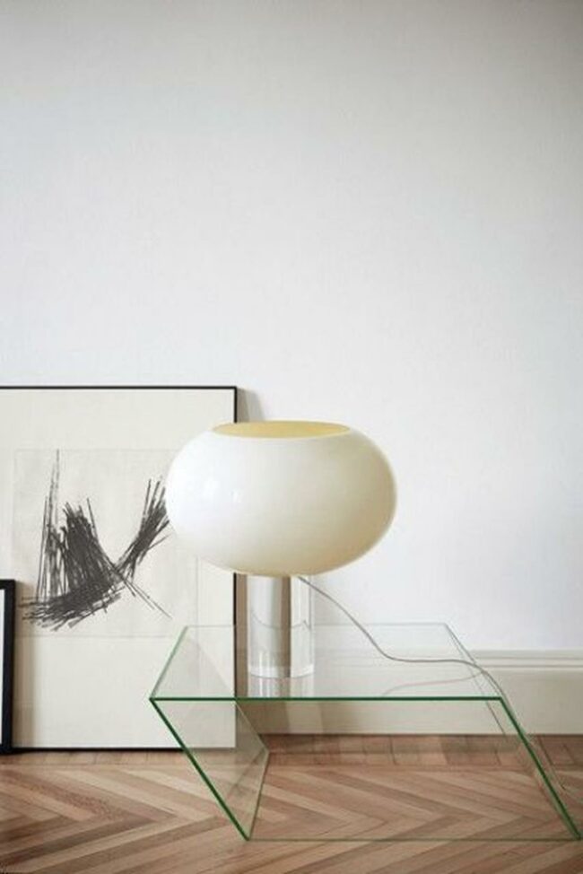 A round white lamp perches elegantly on the glass surface, casting a gentle illumination.
