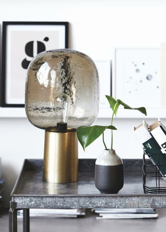 A tall lamp with a clear glass shade and gold base stands on an industrial metal table, anchoring the room's aesthetic.