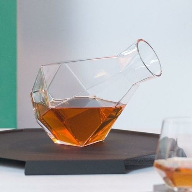 Sharp geometric angles define the decanter's sleek design, drawing your gaze immediately.